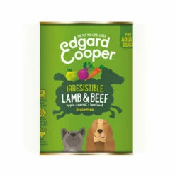 Edgard & Cooper Adult – Lamm & Rind – in der Dose ist auch als leckeresFutter mit Fleischstückchen erhältlich.