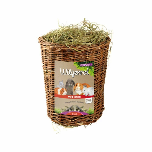 Die Weidenrolle von Esve ist ein Naturprodukt für Kaninchen und Nagetiere. Die Rolle ist aus Weidenholz geflochten und mit schmackhaftem Heu gefüllt. Ihr Haustier kann an der Weidenrolle nagen, schnuppern, knabbern und mit ihr spielen. Ideal für jedes Kaninchen oder Nagetier, beispielsweise um Langeweile zu verhindern.