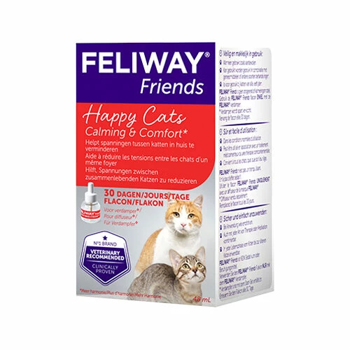 Der Zerstäuber gibt ein geruchloses Pheromon ab, das so genannte Cat Appeasing Pheromone. Dieses Pheromon wird von der Mutterkatze freigesetzt, damit sich ihre Kätzchen sicher fühlen; es sorgt auch dafür, dass sie sich stark aneinander binden. Auf diese Weise trägt Feliway Friends zum Abbau von Spannungen bei und Ihre Katzen kommen besser miteinander aus. Das Starter-Kit wird mit einem Diffusor und einer Nachfüllpackung geliefert. Die Nachfüllpackung ist auch separat erhältlich. Wenn Sie bemerken, dass Ihre Katze auch andere Verhaltensprobleme hat, wie z. B. Urinieren im Haus, Angst und Kratzen, wird empfohlen, Feliway Friends gleichzeitig mit Feliway Classic zu verwenden.