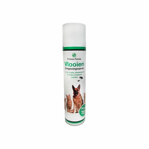 Das Vlooien Omgevingsspray von Firmus Farma enthält Permethrin (0,25 %) sowie Tetramethrin (0,05 %) und ist geeignet für die Bekämpfung von Flöhen und anderen kriechenden Insekten im Haus. Das Spray kann auf Risse, Nähte und andere Orte, an denen sich das Ungeziefer versteckt, aufgesprüht werden. Das Mittel bleibt 4 bis 6 Wochen nach dem Besprühen wirksam.