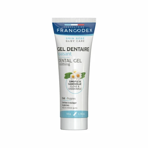Francodex beruhigendes Zahngel unterstützt während der Zeit des Zahndurchbruchs Ihres Welpen. Das Gel hilft, das Zahnfleisch zu beruhigen und unangemessenes Beißverhalten zu reduzieren.
