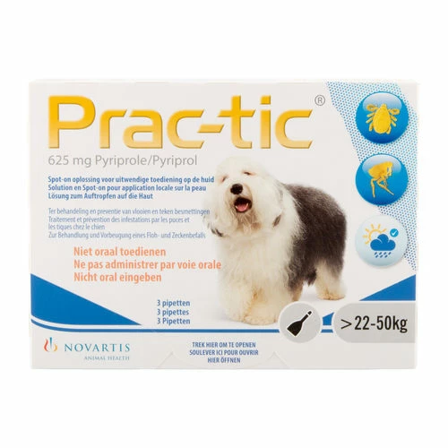 - Für Hunde mit einem Gewicht von 22 – 50 kg: Prac-tic L (625 mg Pyriprol Spot-on-Lösung für große Hunde)