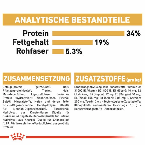 Dehydriertes Geflügeleiweiß, Pflanzenproteinisolat, Reis, Mais, tierische Fette, Maisklebermehl, Pflanzenfasern, Hydrolysat tierischer Eiweiße, Zichorienfasern, Mineralstoffe, Sojaöl, Fischöl, Oligofructose, Hydrolysat von Hefe (Quelle für Mannan-Oligosaccharide), Hydrolysat aus Krustentieren (Quelle für Glucosamin), Borretschöl, Tagetesextrakte (Quelle für Lutein), Hydrolysat aus Knorpeln (Quelle für Chondroitin).