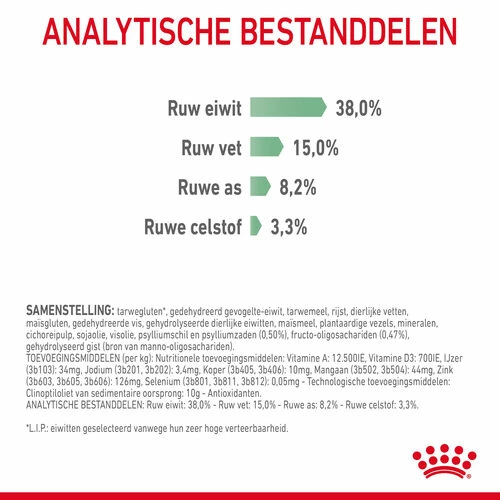 Weizengluten*, dehydriertes Geflügelprotein, Weizenmehl, Reis, tierische Fette, Maiskleber, dehydrierter Fisch, hydrolysierte tierische Proteine, Maismehl, pflanzliche Fasern, Mineralstoffe, Zichorienpulpe, Sojaöl, Fischöl, Flohsamenschalen und Flohsamen (0,50%), Fructo-Oligosaccharide (0,47%), hydrolysierte Hefe (Quelle für Manno-Oligosaccharide)