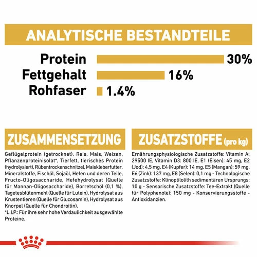 Geflügel dehydrierte Proteine, Reis, Mais, Isolat aus pflanzlichen Proteinen, Weizen, tierische Fette, Hydrolysat aus tierischen Proteinen, Maiskleber, Rübenschnitzel, Mineralien, Fischöl, Sojaöl, Hefe, Fructo-Oligo-Saccharide, Hefe-Hydrolysat (Quelle für Manno-Oligo-Saccharide), Borage-Öl (0.1%), (afrikanischer) Tagetes-Extrakt (Quelle des Luteins), Extrakte aus grünem Tee und Trauben (Quelle der Polyphenole), Hydrolysat aus Krustentieren (Quelle des Glucosamins), Hydrolysat aus Knorpel (Quelle des Chondroitins).