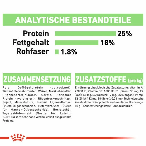 Reis, getrocknetes Geflügelprotein, Weizenfuttermehl, tierisches Fett, Weizen, Maiskleberfutter, Isolat von pflanzlichen Proteinen (L.I.P.: Leicht verdauliche Proteine), Gerste, hydrolysiertes tierisches Protein, Rübentrockenschnitzel, Sojaöl, Mineralien, Fischöl, Lignozellulose, Fructooligosaccharide (0,34 %), Hefehydrolysat (Quelle für Mannan-Oligosaccharide), Borretschöl, Tagetesblütenmehl (Quelle für Lutein). Ernährungsphysiologische Zusatzstoffe: Vitamin A (21500 IE/kg), Vitamin D3 (1000 IE/kg), E1 Eisen (38 mg/kg), E2 Jod (3,9 mg/kg), E4 Kupfer (12 mg/kg), E5 Mangan (50 mg/kg), E6 Zink (150 mg/kg) und E8 Selen (0,06 mg/kg). Technologische Zusatzstoffe: Klinoptilolith sedimentären Ursprungs (10 g/kg), Konservierungsstoffe, Antioxidantien.