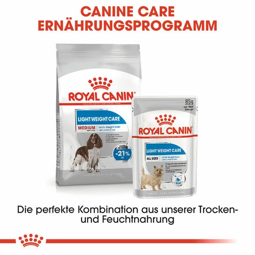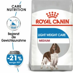 Das Futter Royal Canin Medium Light Weight Care ist eine Gesundheitsnahrung, die Ihrem mittelgroßen Hund hilft, ein gesundes Gewicht beizubehalten. Dieses Futter enthält weniger Kalorien und die richtige Menge an Nahrungsfasern. So bekommt Ihr Hund kein Hungergefühl.