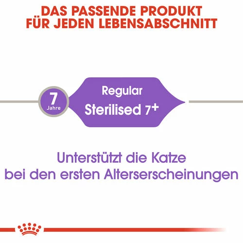 Sterilised 7+ von Royal Canin ist speziell für kastrierte Katzen zwischen dem 7. und 12. Lebensjahr konzipiert, die einen großen Appetit haben. Kastrierte Katzen benötigen weniger Kalorien als andere Katzen. Allerdings nimmt mit der Kastration der Hunger nicht ab, sondern meist eher noch zu. Dieses Futter sorgt für eine lange anhaltende Sättigung und reduziert so ein erneutes Hungergefühl. Zudem unterstützt das Trockenfutter die Nierenfunktion und schützt Ihre Katze gegen allerlei Alterungserscheinungen.