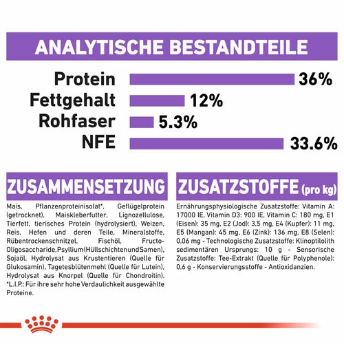 Mais, Pflanzenproteinisolat, dehydriertes Geflügeleiweiß, Maiskleberfutter, Pflanzenfasern, tierische Fette, Hydrolysat tierischer Eiweiße, Weizen, Hefe und Bestandteile, Reis, Mineralstoffe, Rübentrockenschnitzel, Oligofructose, Fischöl, Flohsamen und Flohsamenschalen (Psyllium), Sojaöl, Hydrolysat aus Krustentieren (Quelle für Glucosamin), Tagetesextrakte (Quelle für Lutein), Hydrolysat aus Knorpeln (Quelle für Chondroitin).