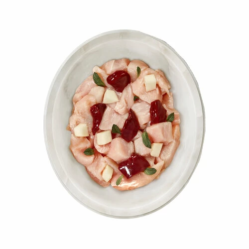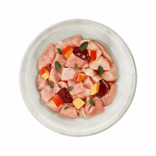Hühnerherz (30%), Hähnchenmagen (26%), Hühnerhaut (14%), Hähnchenmuskelfleisch (10%), Hühnerleber (10%), Kürbis (4%), Tomatenpulver, Rapsöl, Meeresalgen*, Katzenminze*, Mineralstoffe *getrocknet
