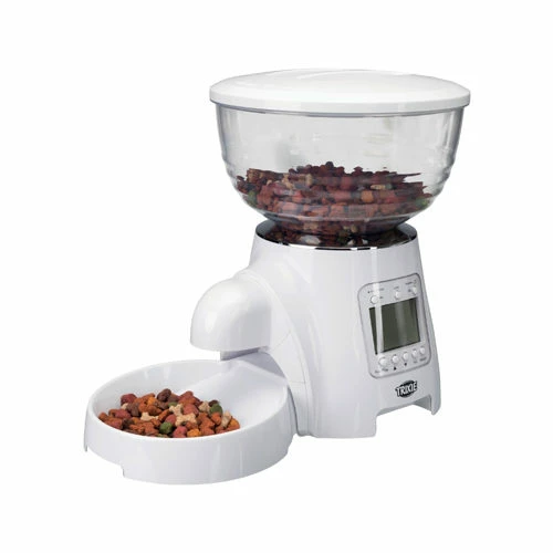 Benötigen Sie einen Futterspender, der Ihren Hund zu mehreren Fütterungszeiten im Laufe des Tages gut versorgt? Der Trixie Futterautomat TX7 ist ein Futterspender, der sich einfach einstellen lässt, und bis zu 5 Fütterungszeiten pro Tag speichern kann. Auch die Menge des Futter können Sie individuell programmieren. Zudem hat dieser Futterautomat eine tolle zusätzliche Funktion: Sie können eine persönliche Nachricht einsprechen und zum Fütterungszeitpunkt abspielen lassen, um die Aufmerksamkeit Ihres Hundes zu wecken.