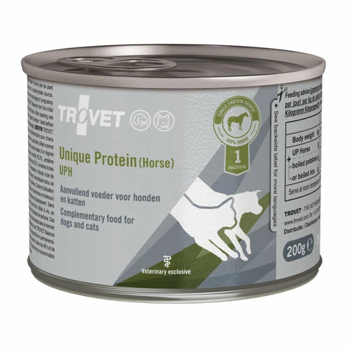 Trovet Unique Protein UPH (Pferd) für Hunde und Katzen besteht aus nur 1 tierischen Proteinquelle: Pferd. Dadurch kann es bei der Zusammenstellung einer Eliminationsdiät verwendet werden. Da es nur aus Pferdefleisch besteht, ist dies keine vollständige Ernährung.