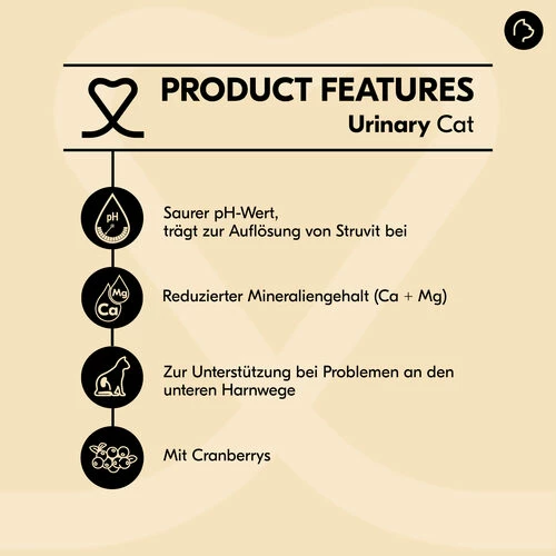 - Hilft bei der Aufrechterhaltung eines niedrigen pH-Werts im Urin (saurerer Urin), um Struvitkristalle aufzulösen und zu verhindern